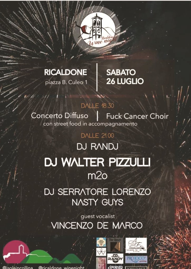 | Sabato 26 luglio ore 19.00: concerto diffuso e degustazioni per le vie del centro storico di Ricaldone; ore 20.00: esibizione del FuckCancer Choir presso la parrocchiale SS. Simone e Giuda; ore 22.00: serata disco: dj set con Walter Pizzulli per ballare fino a tardi. ingresso libero |