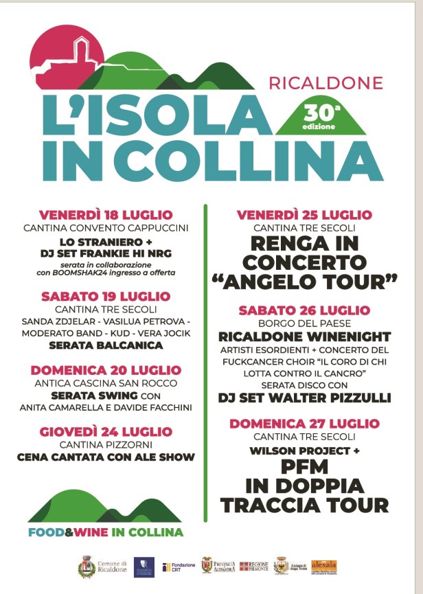 Alla tradizionale esibizione canora dell’“L’Isola in Colina” sarà abbinata la settima edizione della “Food & Wines in collina”, manifestazione durante la quale sarà possibile gustare numerosi piatti dello “street food” locale (farinata, arrosticini, panini con bollito, acciughe al verde, ravioli fritti, etc.) negli stand di numerosi espositori e assaggiare i famosi vini dei produttori di Ricaldone a partire dalle 18:00.