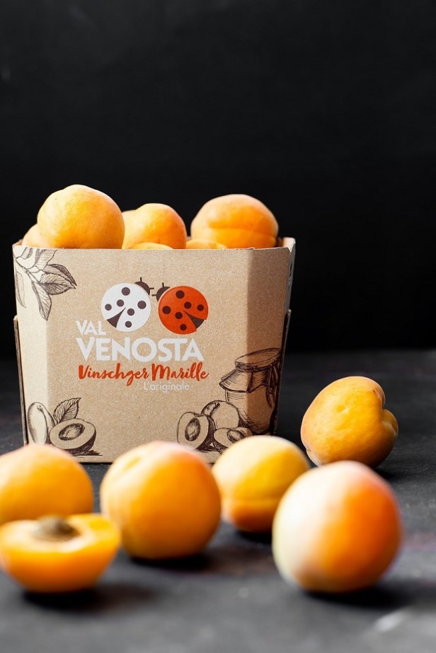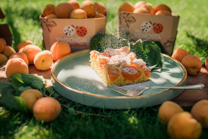 Le albicocche della Val Venosta, famose per la loro qualità e intensità aromatica, aggiungono un tocco fresco e leggermente acidulo che bilancia perfettamente la morbidezza dell’impasto alle mandorle.