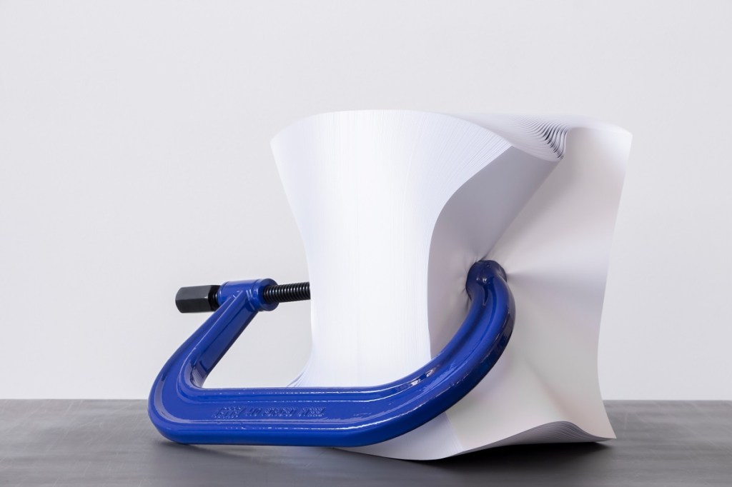 La mostra prosegue al primo piano di Villa Marigola, nelle sale già interessate dalla personale Memotopography di Carlos Garaicoa lo scorso anno, dove è raccolta una selezione di dieci opere di Arcangelo Sassolino che approfondiscono il tema della percezione della tensione visiva e sonora attraverso l’accostamento di materiali opposti, come gomma e ferro, carta e acciaio, vetro e pietra, come nell’opera Sospensione della scelta (2025). In tutti i lavori, nonostante si avverta la possibilità di un collasso imminente, Sassolino non giunge mai al punto di rottura.