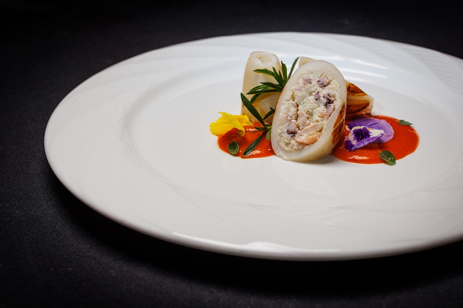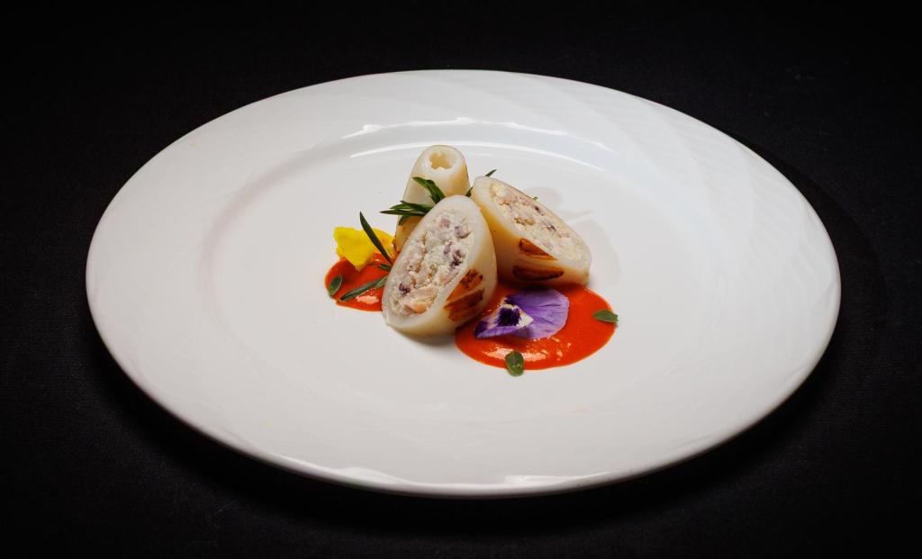 Il protagonista è il calamaro, scelto freschissimo e farcito con una cremosa ricotta di pecora, arricchita da menta fresca, limone biologico e un tocco di aglio dorato in padella. A rendere il piatto ancora più vivace, due salse tiepide ai pomodorini gialli e rossi, spellati a mano e frullati con un filo di olio extravergine d’oliva, che donano colore, freschezza e un equilibrio perfetto di sapori.