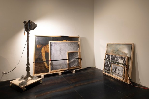 Nell’intenzione dell’artista di trasformare la fotografia in un oggetto fisico, si collocano le stratificazioni, una serie di opere che realizza dal 2022 sovrapponendo fotografie e dipinti, tenuti insieme da un sistema di cinghie e tensionatori. Qui il tema della molteplicità si somma a quello della cancellazione: dalla ipervisibilità di un mondo che Benassi ha sempre rischiarato con la luce di un flash si passa alla sua negazione. Eppure, non c’è contraddizione, perché Benassi ha sempre trattato la fotografia come gesto, evento, espressione di una volontà, prova di esistenza, al di là dell’immagine, spostando l’attenzione da ciò che si vede a tutto quello che sta intorno, sia dal lato dell’autore, sia dell’osservatore.