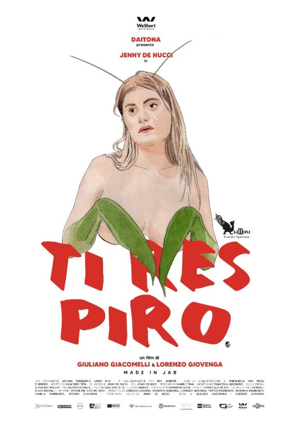 Presentato in anteprima come evento speciale alla 55a edizione del Giffoni Film Festival il 22 luglio “Ti respiro”, il nuovo cortometraggio diretto dal duo JAB, formato da Giuliano Giacomelli e Lorenzo Giovenga, con protagonista Jenny De Nucci. Il film, un WeShort Original distribuito da Cattive Distribuzioni e in partnership con Giffoni Hub, è disponibile sempre dal 22 luglio, su RaiPlay e Rai Cinema Channel.