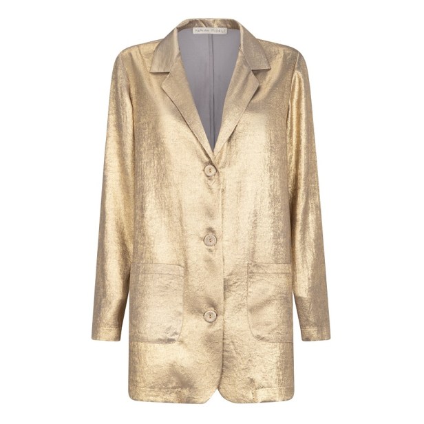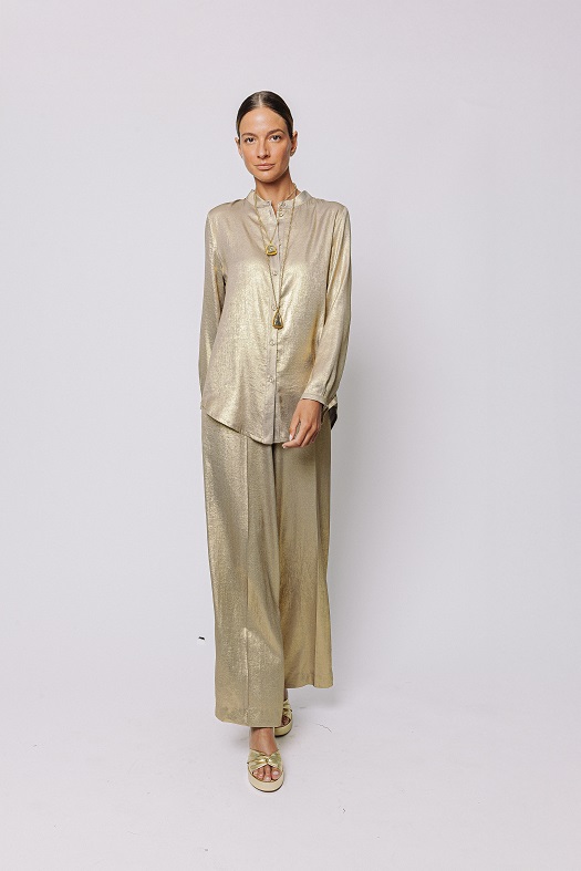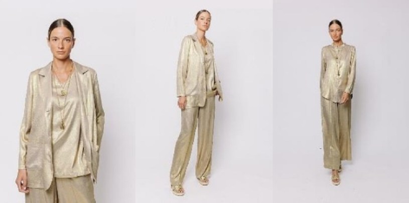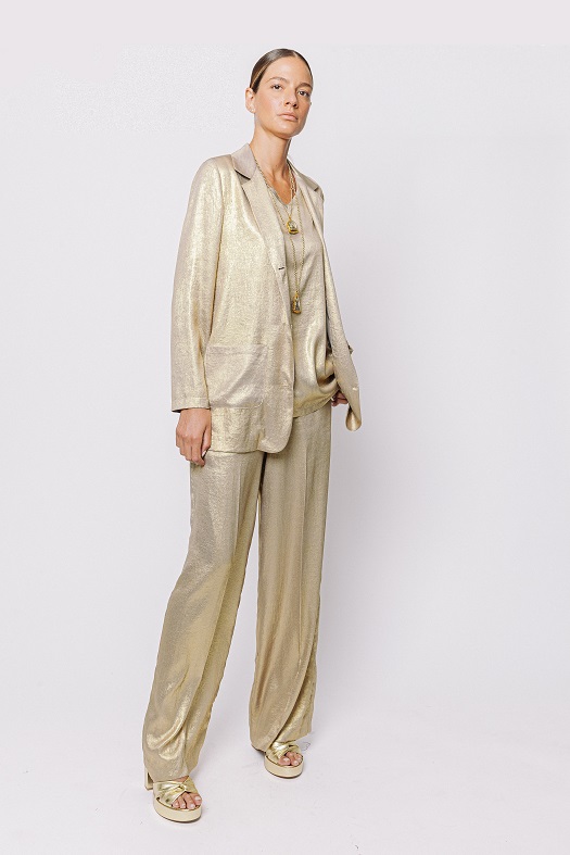 Il cuore del progetto è un completo in tessuto dorato laminato – top, camicia fluida, pantaloni ampi e blazer destrutturato – che reinventa il concetto di layering con naturalezza e modernità. I volumi sono morbidi, le linee essenziali, le superfici setose riflettono la luce con grazia: ogni capo diventa un gioiello da indossare, ma senza ostentazione.