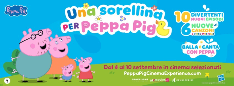 Dal 4 al 10 settembre tutti invitati al cinema per la grande festa di benvenuto a Evie, la nuova sorellina di Peppa e George. Nuovi episodi, canzoni inedite e videoclip musicali per un divertimento assicurato per tutta la famiglia! Organizzato da Hasbro Italia in collaborazione con Nexo Studios.