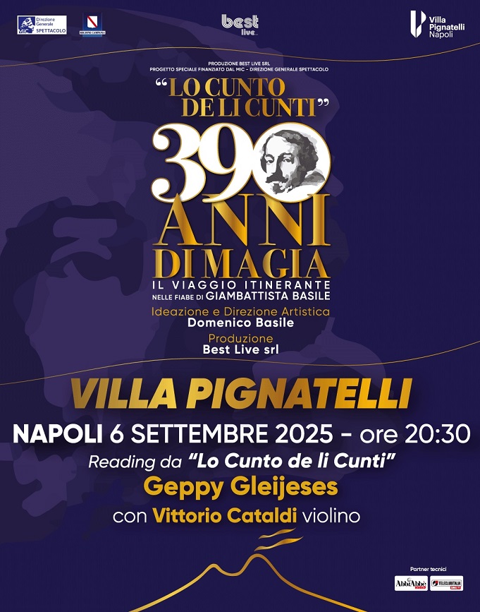Il 6 settembre di scena a “Villa Pignatelli Lo Cunto de li Cunti – 390 ANNI DI MAGIA” un viaggio itinerante nelle fiabe di Giambattista Basile, in occasione dell’anniversario della prima pubblicazione del capolavoro, attraverso convegni, spettacoli e reading letterari affidati ad artisti di fama nazionale in luoghi significativi di Napoli e Giugliano, sua città natale.