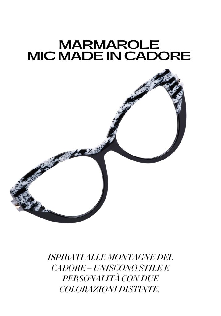 Gli occhiali Mic Made in Cadore – modello Marmarole, ispirati alle montagne del Cadore – uniscono stile e personalità con due colorazioni distinte. Il frontale in bianco/nero striato e nero evoca natura e sogno, ideale per chi cerca un occhiale ammiccante. Due anime.