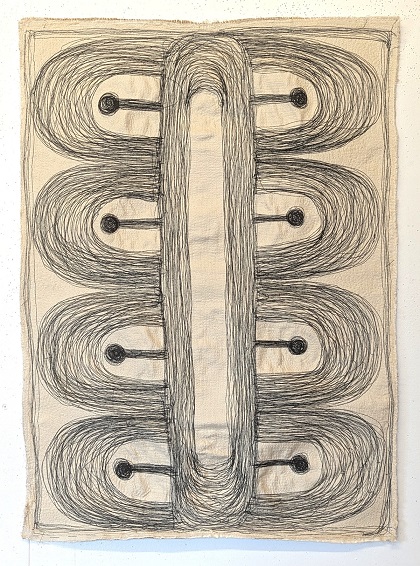 In “Stitched Lines”, la linea cucita si fa segno, scrittura e riflessione: dalle forme organiche della natura alle composizioni geometriche, dense o rarefatte, che ricordano un disegno a matita, restituzione di un paesaggio che è al contempo naturale e culturale, stratificazione storica e sublimazione immaginaria. La pratica artistica di Kelly si inscrive in un discorso contemporaneo che valorizza l’intimità dell’atto del ricamo come forma di resistenza e di riconnessione con il proprio territorio e le proprie radici culturali. La linea cucita non è soltanto un elemento estetico, ma un simbolo di cura e appartenenza, un mezzo per tessere legami tra le generazioni e per preservare la storia di un mondo rurale in rapida trasformazione. Attraverso l’arte, Kelly offre una testimonianza viva di un rapporto con la terra che è al contempo personale e collettivo, fisico e spirituale, dove la memoria si incarna nel gesto e nella materia.
