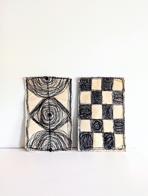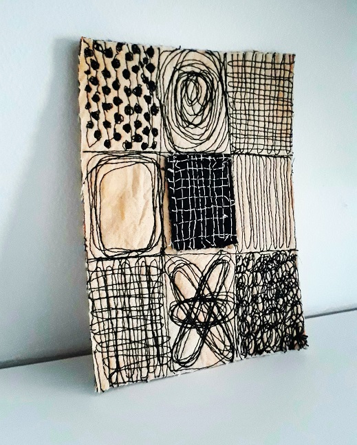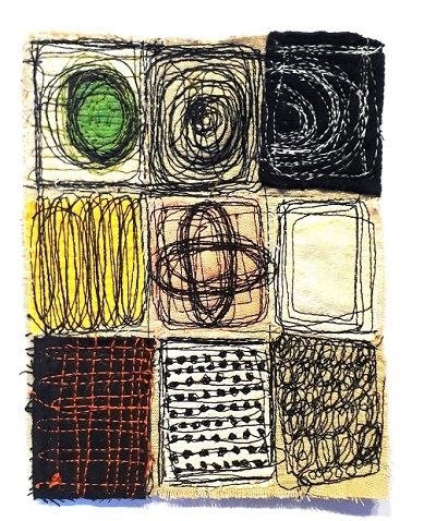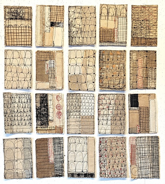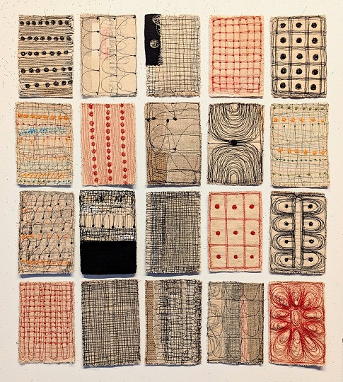| Immagine 1 Patricia Kelly, Installation of 20 Stitched Drawings, Each 15.5 x 10.5cm 2024. Machine stitch on collage of recycled and naturally dyed textile. Immagine 2 Patricia Kelly, Installation, 20 Stitched Drawings, each 15.5 x 10.5cm 2024. Machine stitch on collage of recycled and naturally dyed textile Immagine 3 Patricia Kelly – installation of 20 Stitched Drawings. Machine Stitch on collage of recycled and naturally dyed textiles. Each drawing, 15.5 x 10.5cm , 2024 |