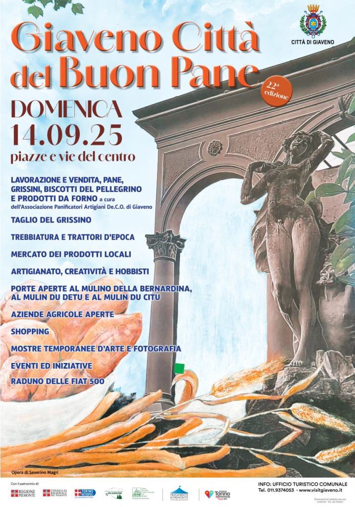 In Val Sangone il profumo e il sapore autentico della tradizione sono quelli garantiti ogni mattina dai panificatori, che domenica 14 settembre animeranno il centro storico per la ventiduesima edizione della manifestazione Giaveno Città del Buon Pane, un evento che è cresciuto negli anni pur rimanendo fedele alle origini, che mettono al centro dell’evento gli artigiani e i loro prodotti: i pani della tradizione, come la micca, le biove, la mezzana e lo stirotto, riconosciuti con la Denominazione Comunale d’Origine, ma anche il il Grissino Stirato Torinese, le brioche, i biscotti, le focacce, la pizza e i salatini.