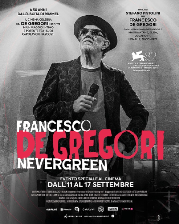 “FRANCESCO DE GREGORI. NEVERGREEN”, prodotto da OUR FILMS, società del gruppo Mediawan, Friends TV, Darallouche e Caravan,è stato presentato in anteprima alla 82. Mostra Internazionale d’Arte Cinematografica di Venezia lo scorso 5 settembre.