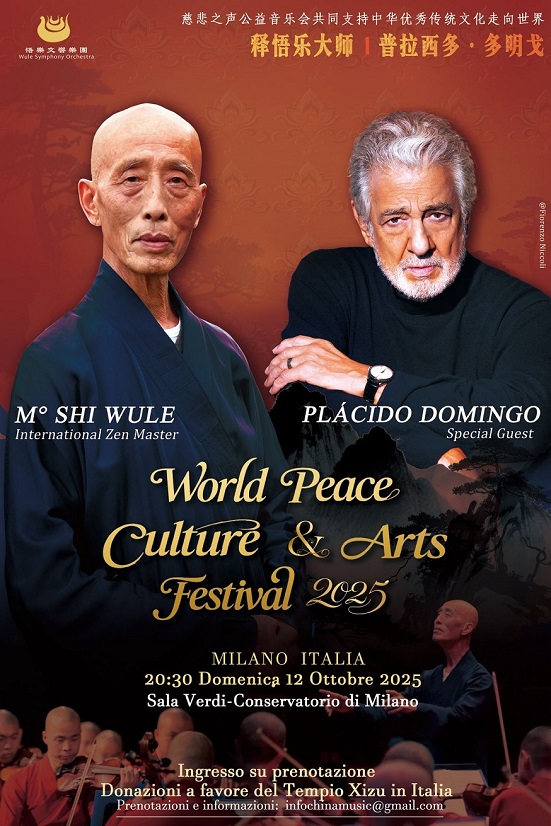 Domenica 12 ottobre al Conservatorio di Milano (alle ore 20.30 nella Sala Verdi), si esibirà la più grande compagnia musicale di monaci Chan del mondo, la WULE SYMPHONY ORCHESTRA, diretta dal Maestro Shi Wule, con la partecipazione del tenore, baritono e direttore d’orchestra, Placido Domingo.L’evento, organizzato dal critico musicale e mediatore culturale tra Italia e Cina Sean White, prevede altri appuntamenti unici che verranno annunciati prossimamente.