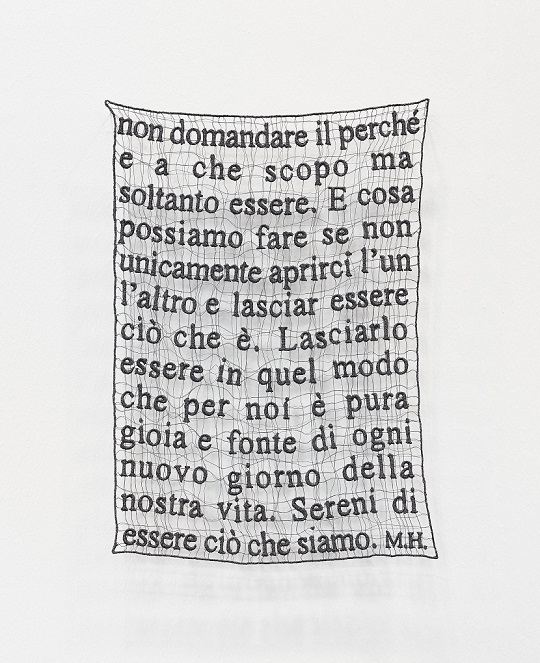 Il percorso si apre con due opere di Sabrina Mezzaqui, Lettere (2010) e Segni (2009), che rendono concreta la dimensione della scrittura, filo rosso dell’esposizione insieme al tempo che permette di inglobarla nell’opera d’arte, ma che in questo caso è essa stessa oggetto dell’opera e non uno strumento per la sua interpretazione.