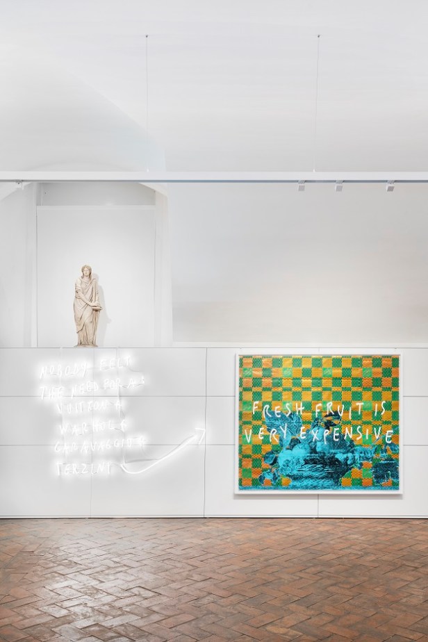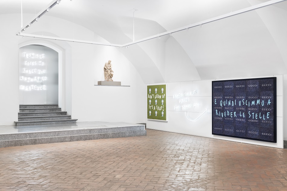 Questa mostra è un vero e proprio viaggio nell’anima di Milano, una città che pulsa di vita, di creatività e di cultura. Pietro Terzini, con la sua cifra stilistica unica, ci invita a scoprire un mondo di opere su carta, neon e specchi, dove le parole sono protagoniste assolute. Ma non solo: accanto ai testi, appaiono elementi figurativi iconici, veri e propri omaggi a Milano e all’Ambrosiana (la prima Biblioteca aperta al pubblico in Europa e il Museo più antico di Milano), tra cui la Canestra di Caravaggio e la Madonnina, che ci portano in un dialogo profondo tra memoria e contemporaneità e inevitabilmente ad un confronto tra presente e passato, tra iconografia classica e linguaggio culturale pop-contemporaneo.