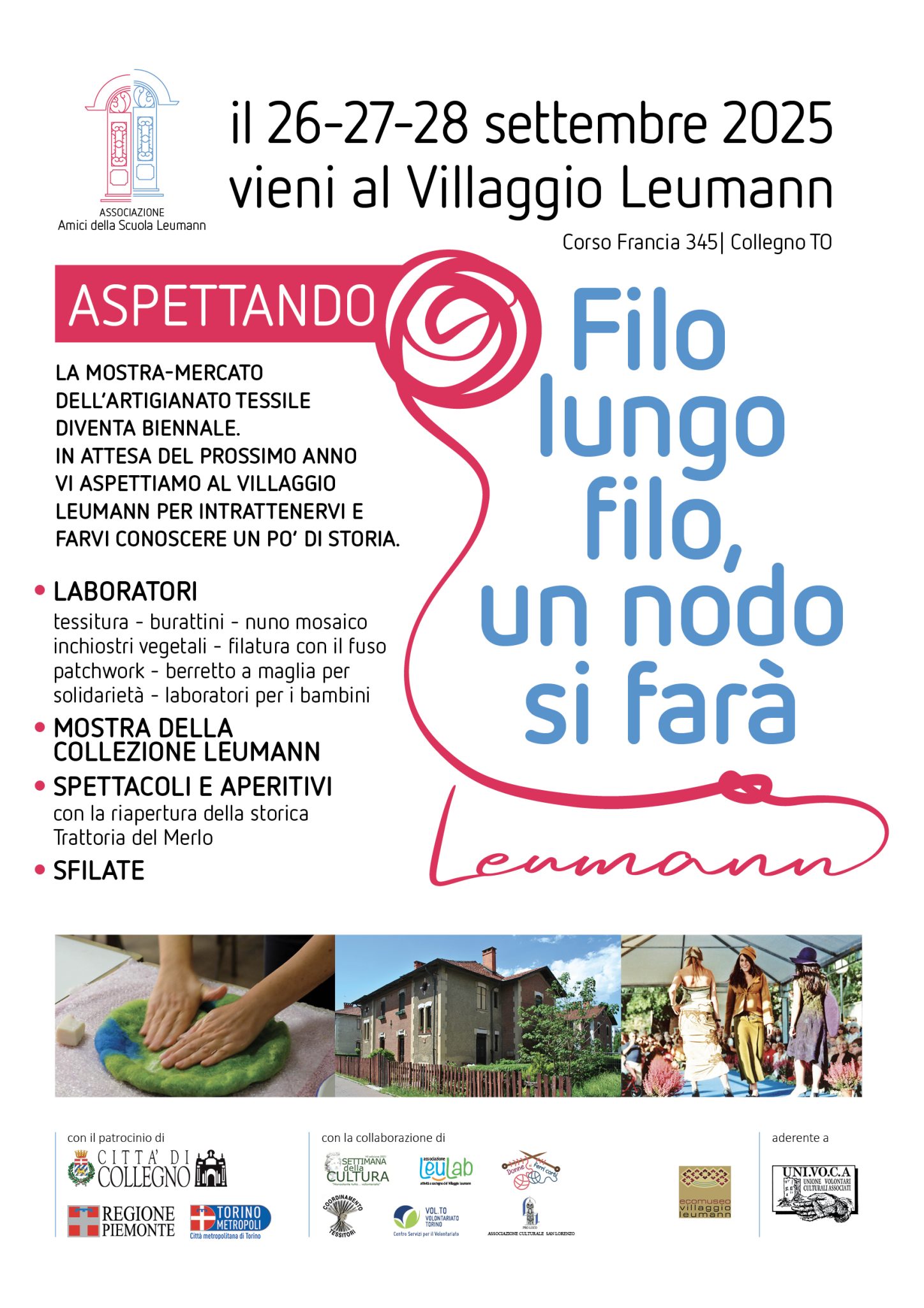 Dal 26 al 28 settembre, il Villaggio Leumann a Collegno si anima per una nuova edizione di “Filo lungo filo, un nodo si farà“, la manifestazione curata dall’Associazione Amici della Scuola Leumann, riconosciuta dagli operatori del settore tessile come una imperdibile occasione per dare il giusto spazio e risalto ai tessitori provenienti da luoghi diversi.