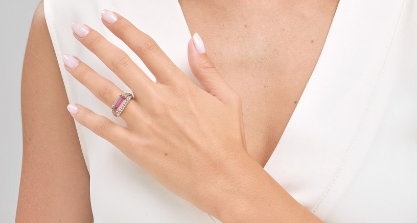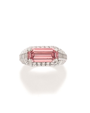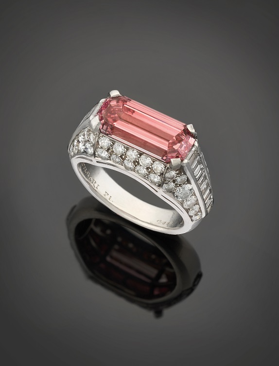 Il diamante rosa è di taglio rettangolare a gradini di 3,18 carati, accompagnato da certificato GIA attestante che è Natural Fancy Intense Pink, VS2, di tipo IIa: una gemma dal fascino eterno, tra le più ricercate e ambite al mondo. L’anello si presenta ulteriormente ornato da 64 diamanti taglio brillante rotondo e baguette, per un totale di 1,93 carati.