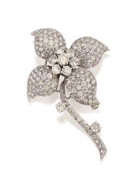 Tra gli altri lotti si segnalano un paio di eleganti orecchini Chandelier in diamanti e zaffiri, per rispettivi 10 e 40 carati circa (lotto 77, base 9 mila euro), una raffinata spilla a motivo floreale in platino e diamanti di Frascarolo prima maniera, precedente alla fase animalier (lotto 165, base 5 mila euro), una clutch in oro firmata Massoni Roma (lotto 86, base 20 mila euro), e un vero e proprio oggetto da collezione: un bracciale Diorama di Christian Dior in oro bianco e pavé di diamanti, disegnato richiamando le forme del vestito Diorama con le sue pieghe e i drappeggi avvolgenti, creato dallo stilista nel 1951 (lotto 265, base 5 mila euro).