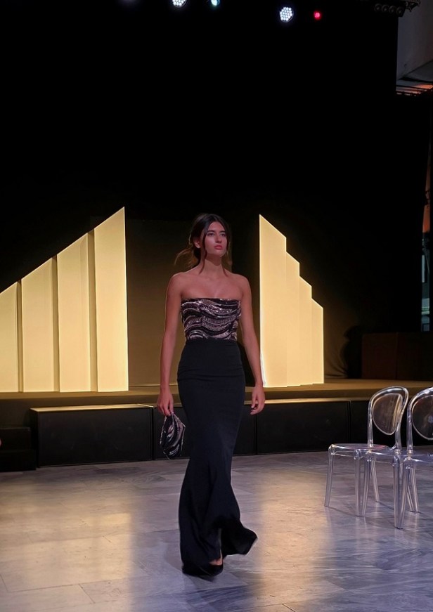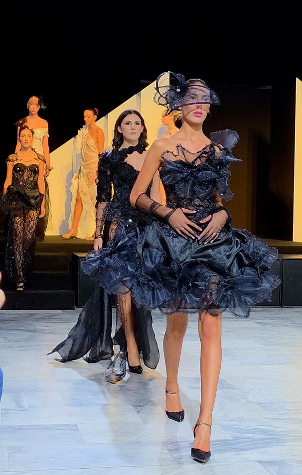 Dalil Douache ha incantato con creazioni che uniscono identità e contaminazioni culturali. L’uso di tessuti preziosi – sete indiane, vietnamite, broccati e ricami – si è intrecciato con richiami alla ricchezza decorativa e alle suggestioni del mondo arabo, per una collezione densa di eleganza e significati.