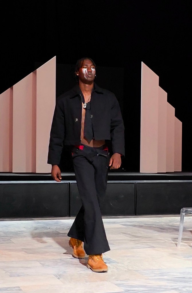 Umor.nero, il progetto di Emanuele Paglioni, ha scelto la strada della performance. Comparse hanno sfilato mascherate, avvolte in felpe con la scritta “Malinconia Member Only” e si sono posizionati da sfondo alle modelle in total black. Una sorta di citazione potente da Squid Game. Un momento scenico, capace di lasciare il segno nella memoria degli spettatori.