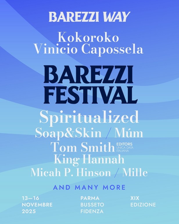 IL PROGRAMMA MUSICALE DI BAREZZI FESTIVAL 2025 L’avventura musicale di Barezzi Festival comincia giovedì 13 novembre dal Teatro Verdi di Busseto con i múm, band islandese capace di plasmare suggestive sperimentazioni sonore mescolando elettronica, voci morbide, glitch, campionamenti innovativi e misterici con strumenti tradizionali e non convenzionali. Con una carriera quasi trentennale alle spalle e collaborazioni con artisti come Kyle Minogue, Jóhann Jóhannsson e la storica Orchestra Sinfonica della radio di Lipsia, dopo anni di silenzio i mùm hanno appena pubblicato History of Silence, il loro settimo album in studio. Venerdì 14 novembre il Teatro Regio di Parma apre le sue porte a due live imperdibili: alle 18 protagonisti i King Hannah, ipnotico duo di Liverpool composto da Hannah Merrick e Craig Whittle. Il loro ultimo singolo Suddenly, Your Hand, uscito quest’estate, arriva sulla scia del successo del secondo album Big Swimmer che ha riscosso gli entusiasmi di pubblico e critica grazie a una miscela di cantautorato intimo e immaginifico, a tratti pungente, e chitarre capaci di infiammarsi e spiccare il volo, confermandoli come uno dei progetti più potenti e intriganti in circolazione. A seguire, alle 21, arriva Tom Smith per l’unica data italiana del tour del suo nuovo progetto solista. Il chitarrista e cantautore britannico, frontman degli Editors, presenterà sul palco in anteprima il suo primo album There Is Nothing in the Dark That Isn’t There in the Light, in uscita il 5 dicembre e anticipato dai singoli Lights Of New York City e Life is For Living. Un lavoro che esplora una dimensione totalmente diversa da quella di energia esplosiva della sua band, abbracciando un cantautorato morbido e delicato, semplice, puro e toccante. La serata si chiude poi a Borgo Santa Brigida alle 23 con il live di Mille, eclettica cantautrice e musicista dalla voce inconfondibile, da diva d’altri tempi, e dalla rara forza espressiva, fresca di uscita del nuovo album Risorgimento. Sabato 15 novembre si comincia al Teatro Regio alle 18 con Soap & Skin, moniker della musicista e produttrice austriaca Anja Franziska Plaschg, che presenta il suo ultimo lavoro Torso: una raccolta di cover per riscoprire la bellezza di fuggire da se stessa, brani che prendono nuova vita in modo introspettivo e visionario grazie a una multiforme raffinatezza espressiva e a sonorità mai banali. Un esempio è Mystery of Love di Sufjian Stevens, la cui versione originale è contenuta nella colonna sonora del film di Guadagnino “Chiamami con il tuo nome”, e che l’artista riarrangia per corno francese e trombone, caricandola di nuovi livelli di interpretazione. A seguire, alle 21, arrivano gli Spiritualized, storica band inglese capitanata da Jason Pierce. Il loro ultimo e decimo album, Everything was beautiful, è l’ennesima conferma del sound straordinario del gruppo che volteggia lungo rotte psichedeliche e accordi ripetuti quasi ossessivamente ma sempre melodicamente orecchiabili, capace di essere al tempo stesso semplice e complesso, nitido e oscuro. Domenica 16 novembre il festival si chiude al Teatro Magnani di Fidenza con Micah P. Hinson, figura di culto dell’alt-folk americano, con il suo nuovo album The Tomorrow Man, in uscita il 31 ottobre. Prodotto da Alessandro Asso Stefana e anticipato dai singoli Oh, Sleepyhead e One Day I Will Get My Revenge, il disco arriva dopo una profonda crisi creativa e anni di trasformazione personale e artistica. Un album coraggioso e sincero, viscerale e introspettivo, per la prima volta interamente radicato nel suo e nel nostro presente.
