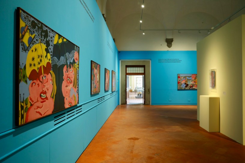 Il percorso si apre con la serie Amore e divorazione, presentata per la prima volta nel 1969, in cui l’artista mette in scena un’esplosione di corpi scomposti, mascheroni grotteschi, bocche e vagine coloratissime. Queste tele segnano la rottura con la pittura più cupa degli esordi e traducono la carica contestataria del Sessantotto in un linguaggio pittorico esuberante e provocatorio, definito in quegli anni da Dino Buzzati come un intreccio di pop art, sesso, sadismo e carnevali popolari.