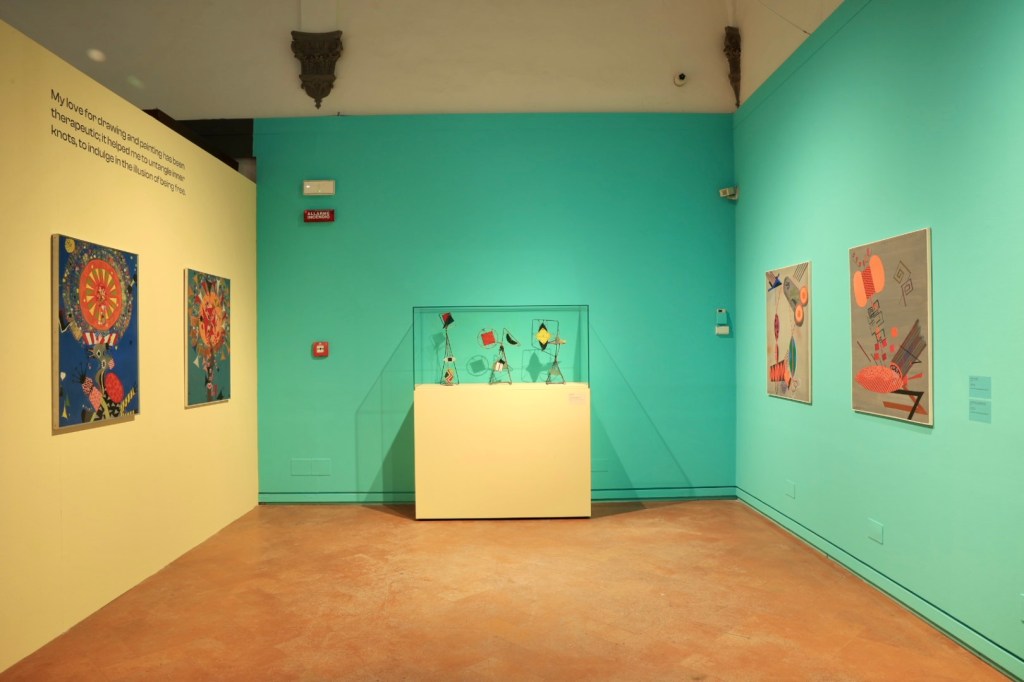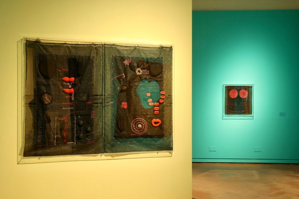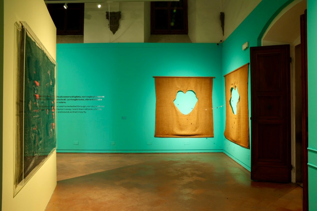 Il percorso prosegue con le opere degli anni Ottanta e Novanta, tra cui arazzi, installazioni e lavori su carta cucita che assumono la forma di diari visivi in cui confluiscono testi, poesie, frammenti autobiografici e materiali leggeri come tulle, paillettes e organza, in un gioco ironico con l’estetica della moda e della frivolezza femminile. In questi lavori l’arte diventa spazio di autocoscienza e di liberazione, ma anche esorcizzazione di traumi personali e collettivi. Non mancano autoritratti, come l’opera Io Micol, in cui l’artista si raffigura insieme al suo cane, suggerendo un’identità aperta e non gerarchica tra essere umano e animale.