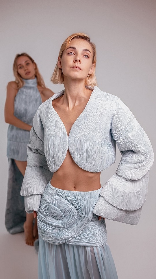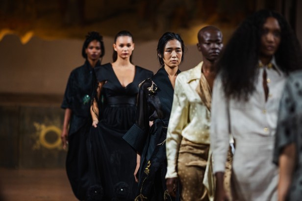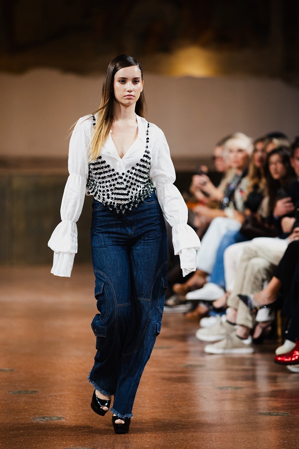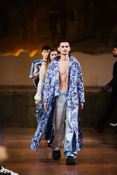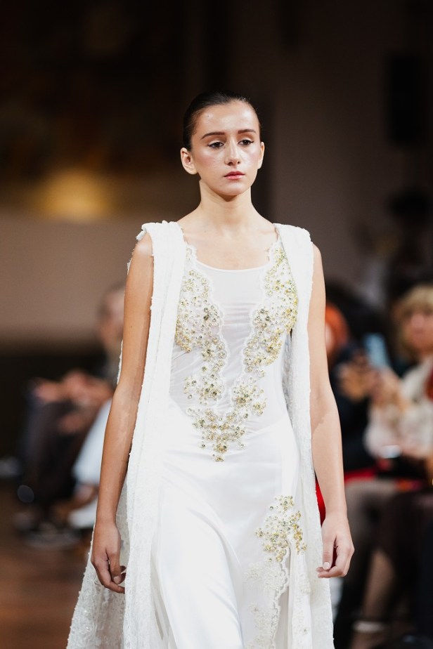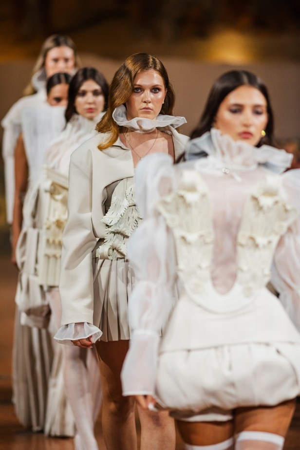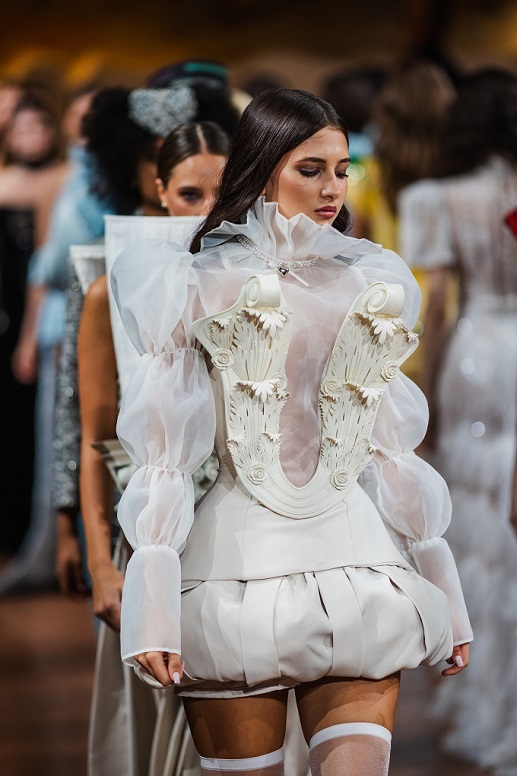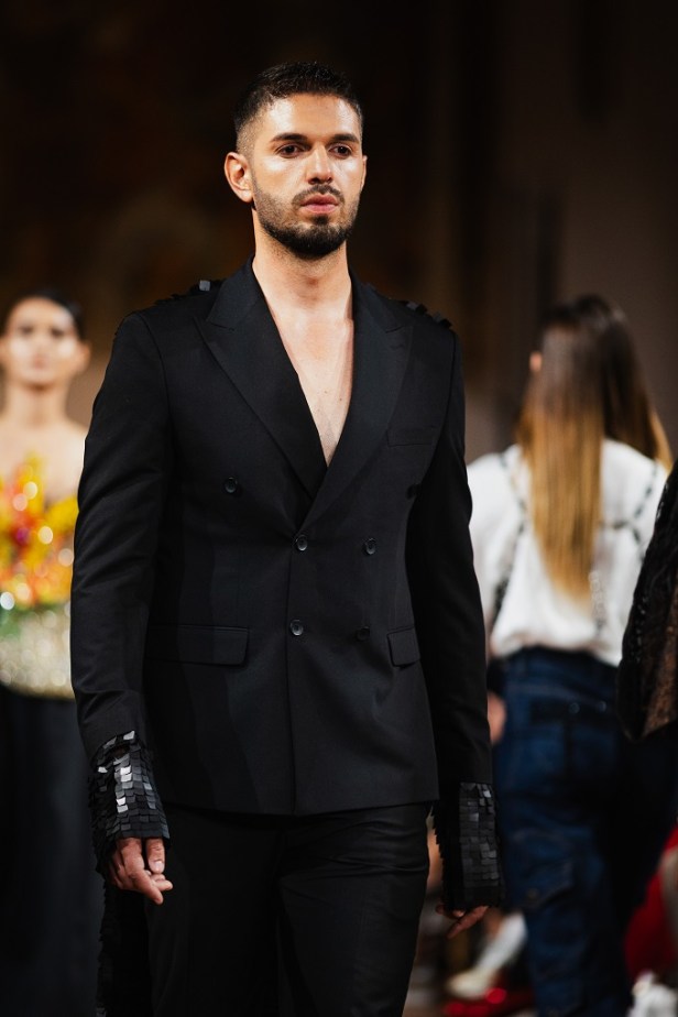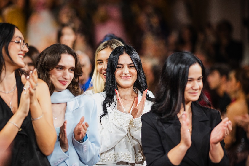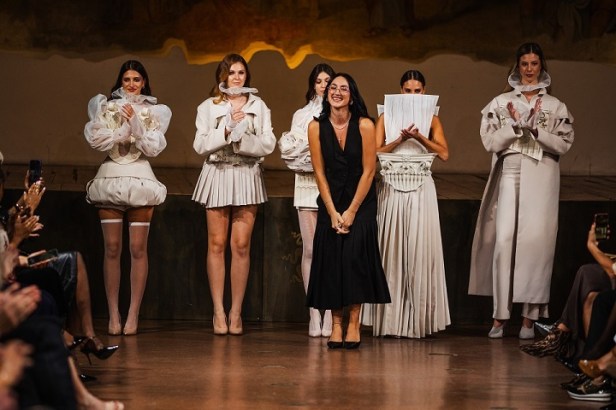 Dall’Albanian Design Academy sono arrivate interpretazioni altrettanto potenti e cariche di identità: Ezgi Özalan ha incantato la platea con creazioni che sembravano stratificazioni dell’anima, forza e fragilità fuse in un equilibrio misterioso, ogni abito un enigma poetico che trasformava il tessuto in emozione; Klarisa Vulaj ha sorpreso con linee grafiche e contrasti che hanno ridisegnato la percezione dello spazio, creando architetture dinamiche e prospettive nuove, un manifesto di audacia capace di lasciare un segno indelebile; Denisa Pace ha conquistato con un linguaggio ibrido e visionario, un mosaico ipnotico di suggestioni e materiali che mutava a ogni sguardo, trasformando la passerella in un caleidoscopio vibrante e inafferrabile.