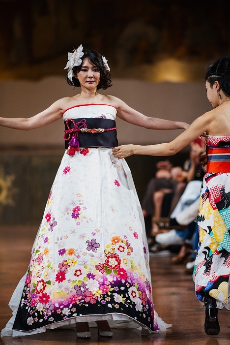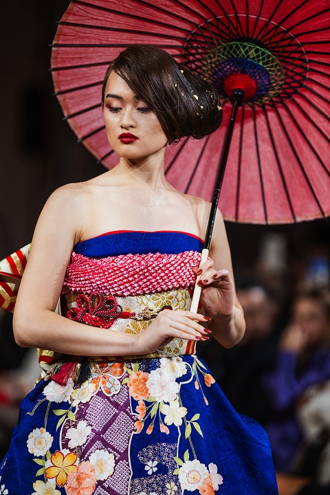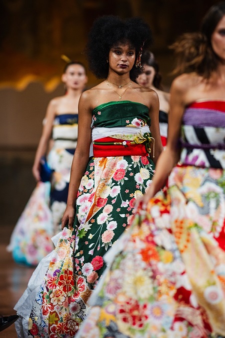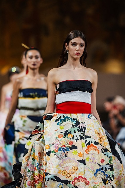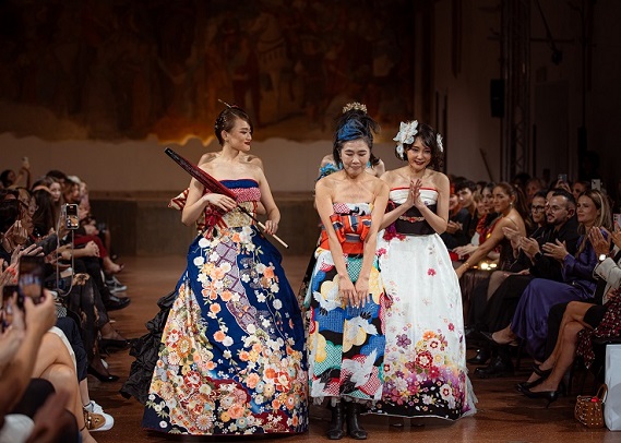 Dall’oriente Sora Watanabe ha orchestrato il successo della sua collezione con un team super specializzato composto da sarti, fotografi, videomaker e coreografi, ognuno essenziale per il risultato straordinario della GX Fashion Week. Sora ha trasformato i tradizionali kimono giapponesi in eleganti abiti senza tagliare né danneggiare il tessuto, valorizzando l’armonia tra tradizione giapponese e moda contemporanea. Conservando la forma e lo spirito originali del kimono, ha creato design innovativi che hanno celebrato sia il patrimonio culturale sia l’individualità di chi li indossava. Il suo concetto, noto come “Kimono Dress”, ha ricevuto elogi per l’approccio rispettoso alla tradizione e per l’appeal contemporaneo.