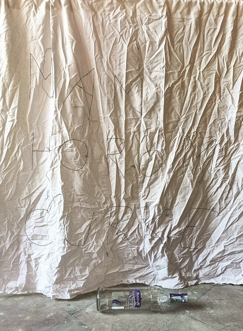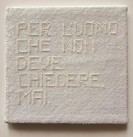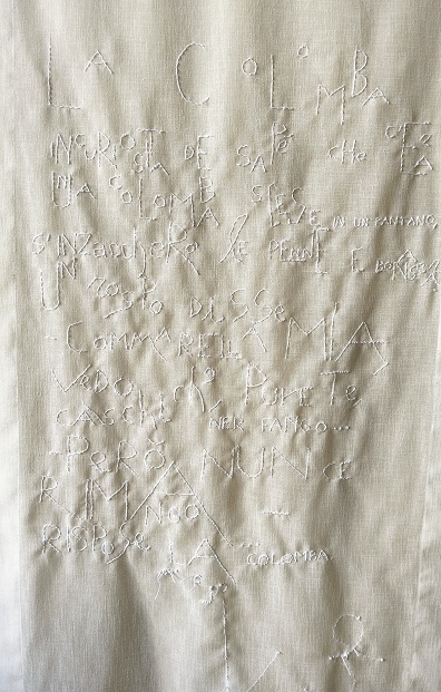 Il percorso inizia con la tenda ricamata con La colomba di Trilussa: un gesto liminale che invita a oltrepassare la soglia delle illusioni per interrogarsi sulla realtà nella sua essenza più nuda. È qui che si apre il primo capitolo, Disenkanto, parola giudesma che racchiude l’esperienza della perdita dell’incanto, della frattura tra ciò che si desidera e ciò che la realtà impone. L’installazione si compone di ricami bianchi su bianco di celebri slogan pubblicitari degli anni Ottanta, decenni ottimista e fiducioso, oggi svuotati e resi spettrali dalla consapevolezza delle contraddizioni e delle crisi che hanno seguito quelle promesse di benessere e progresso.