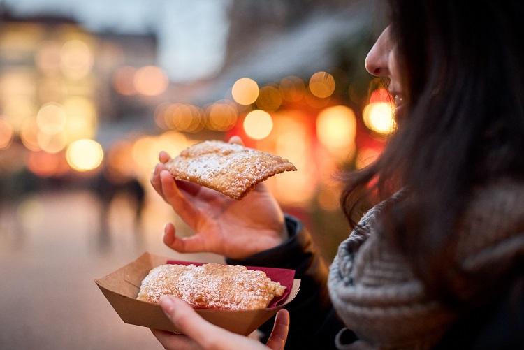 Al mercatino di Natale non mancano certo le occasioni per gustare prelibatezze gastronomiche. Da un lato ci sono le bancarelle che vendono prodotti locali, regionali e tipici da asporto, dall’altro quelle dove è possibile deliziare il palato.