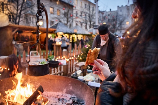 Alla bancarella Annemaries Standl si possono gustare Schlutzkrapfen verdi con impasto di patate e ripieno di spinaci e il tradizionale Kaiserschmarrn. E per coronare il tutto, un delizioso punch di bosco, con o senza alcol, che riscalda il cuore e accende la fantasia. Patatine fritte, chips di patate e dolci krapfen, insieme a sidro di mele caldo e vin brulé di produzione propria e un profumato liquore natalizio a base di liquore di noci, sono offerti da Martin Rastner al suo stand Knöspele. Pauli Braido offre allo stand Wallys un mix di piatti tipici dell’Alto Adige e delle regioni limitrofe.