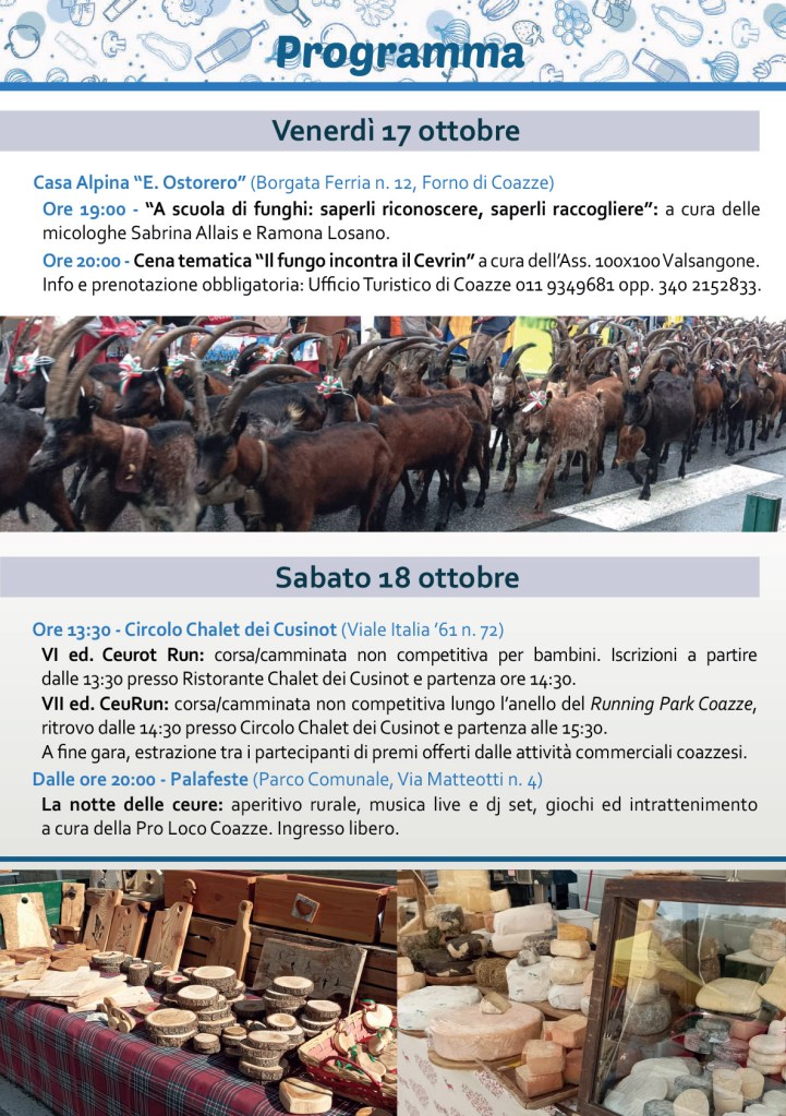 In occasione della Festa, venerdì 17 ottobre alle 19 alla Casa Alpina Evelina Ostorero in borgata Ferria è in programma un incontro con le micologhe Sabrina Allais e Ramona Losano sul tema “A scuola di funghi: saperli riconoscere, saperli raccogliere”, a cui farà seguito la cena tematica “Il fungo incontra il Cevrin”, a cura dell’associazione 100×100 Valsangone, con prenotazione obbligatoria all’Ufficio turistico di Coazze, ai numeri telefonici 0119349681 oppure 3402152833. Nel pomeriggio di sabato 18 a partire dalle 13,30 è in programma al Circolo Chalet dei Cusinot al civico 72 di viale Italia ‘61 il ritrovo dei partecipanti alla CeuRun e alla quarta edizione della Ceurot Run, due corse-passeggiate non competitive per adulti e bambini lungo l’anello del Running Park Coazze. È un’occasione per fare sport divertendosi in compagnia e partecipare all’estrazione di premi a sorpresa tra tutti i partecipanti. Alle 20 nel Palafeste allestito nel parco comunale di via Matteotti 4 inizierà la Notte delle Ceure, che proporrà una cena rurale con accompagnamento musicale.