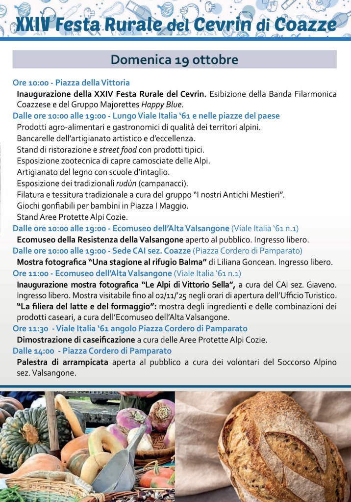 In fiera saranno anche presenti le scuole d’intaglio locali e delle valli vicine e il gruppo “I nostri antichi mestieri”, che proporrà dimostrazioni delle antiche tecniche di filatura e tessitura della canapa. A partire dalle 11 nelle sale espositive al piano terra dell’Ecomuseo dell’Alta Val Sangone si potrà visitare la mostra fotografica “Le Alpi di Vittorio Sella”, curata dalla sezione del CAI di Giaveno. Sempre nella sede dell’Ecomuseo, che resterà aperta dalle 10 alle 19, sarà allestita la mostra “La filiera del latte e del formaggio”, dedicata agli ingredienti e alle combinazioni dei prodotti caseari. La sezione del CAI di Coazze proporrà nella sua sede di piazza Cordero di Pamparato la mostra fotografica “Una stagione al rifugio Balma”, con le immagini di Liliana Goncean. Alle 11,30, in viale Italia ‘61 angolo piazza Cordero di Pamparato, è in programma una dimostrazione di caseificazione, a cura dell’Ente di gestione delle Aree protette delle Alpi Cozie. Per il pranzo, i ristoranti locali proporranno menù dedicati al Cevrin di Coazze e in fiera si troveranno diversi stand di ristorazione e street food. Dalle 14 in avanti, grazie ai volontari della sezione Valsangone del Soccorso Alpino, si potrà salire sulla parete di arrampicata in piazza Cordero di Pamparato. Alle 15 in viale Italia ‘61 i panettieri di Coazze che si fregiano della denominazione comunale De.C.O. proporranno il laboratorio “Il buon pane di Coazze”.