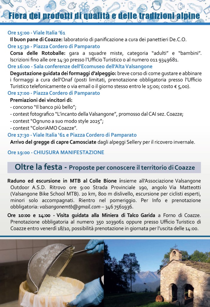 Alle iniziative all’interno della fiera si aggiungono le visite guidate alla miniera di talco Garida e l’escursione in mountain bike al Colle Bione con l’associazione Valsangone Outdoor. Per informazioni sulle escursioni, dettagli sul programma ed eventuali iscrizioni il riferimento è l’ufficio turistico di Coazze, che risponde ai numeri telefonici 350-1039061 e 011-9349681 e all’indirizzo e-mail turismo@comune.coazze.to.it