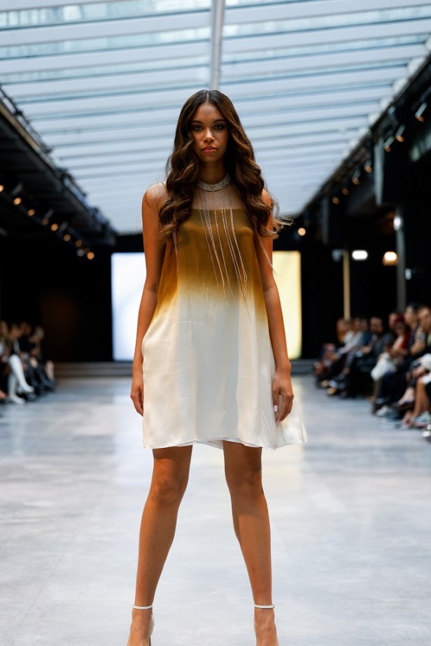 La palette si costruisce sul gioco dei contrasti: bianco e nero, simboli assoluti di eleganza e decisione, toni di grigi metallici che evocano superfici contemporanee e industriali capaci di catturare la luce, tocchi naturali minerali dell’oro e giallo che attraversa l’intera collezione come segno luminoso.