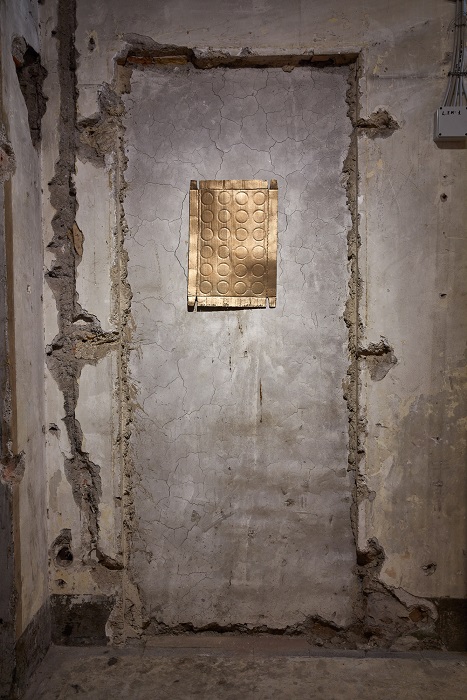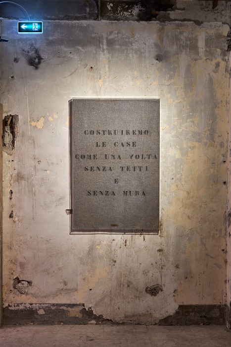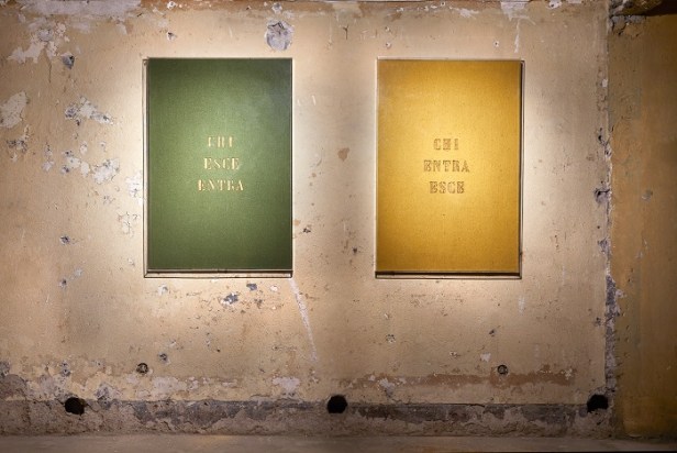Il titolo della mostra – Chi esce entra – è tratto da un’opera in feltro di Vincenzo Agnetti del 1971, in cui la frase è marchiata a fuoco e dipinta sulla superficie. Apparente aporia, suggerisce che gli opposti non siano necessariamente esclusivi, ma possano convergere generando prospettive inattese e nuovi significati. In questo contesto, è la scomparsa imminente dell’edificio a innescare il ricordo, offrendo l’opportunità di riscoprirne la storia. In questo modo, invece di apparire come lo scheletro residuo di un luogo ormai vuoto e privato delle sue funzioni passate, come protagonista della mostra, lo spazio torna una volta popolato da opere e visitator3.