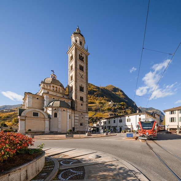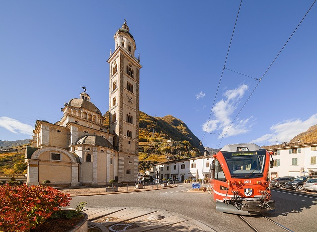Nei primi quindici minuti di viaggio si attraversa il territorio italiano e già da subito lo sguardo è catturato dalle meraviglie del paesaggio. Primo fra tutti, il Santuario della Madonna di Tirano, che si staglia con il suo elegante campanile davanti agli occhi dei viaggiatori.