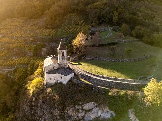 Tra questi vigneti, realizzati con la tradizionale tecnica dei muretti a secco(Patrimonio Culturale Immateriale dell’UNESCO dal 2018), spicca sul versante orientale la chiesetta di Santa Perpetua, uno dei luoghi di culto più antichi della Valtellina, della seconda metà del XII secolo. Situata lungo la via per il Passo del Bernina, la sua posizione strategica la rese per secoli una tappa naturale per viandanti e pellegrini, che trovavano accoglienza nello xenodochio, l’antico ostello di cui restano ancora oggi le tracce.