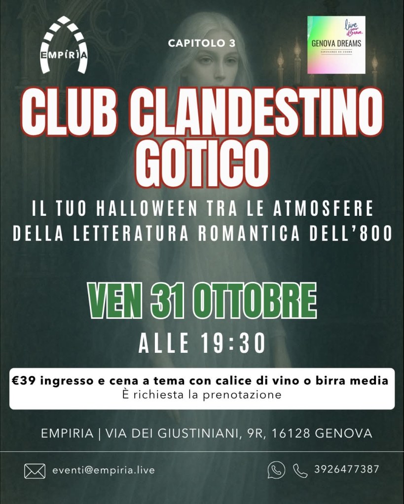 Genova si prepara a vivere un Halloween dal fascino oscuro e raffinato: venerdì 31 ottobre, alle ore 19:30, gli spazi di Empiria (Via dei Giustiniani 9R, Genova) si trasformeranno in un vero e proprio salotto dell’Ottocento, dove le atmosfere della letteratura gotica e romantica prenderanno vita tra luci soffuse e melodie d’altri tempi.