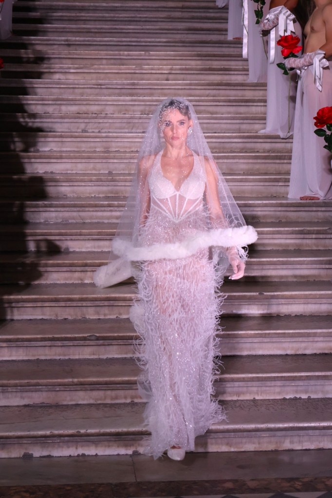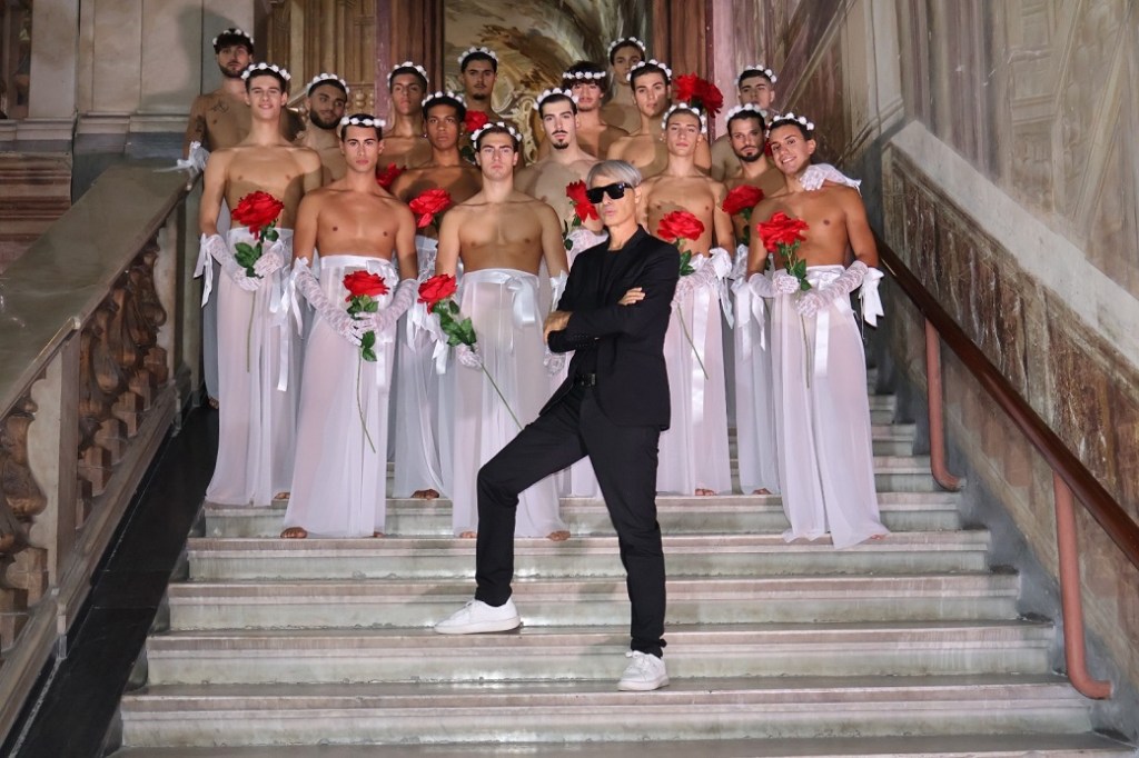 Ad aprire la sfilata, che ha visto la partecipazione di ben seicento ospiti, tra cui il giornalista Alessandro Cecchi Paone, con le note di sottofondo dell’Ave Maria della Callas remixata, un corteo di giovani ragazzi con coroncine sul capo, guanti bianchi, fiori in mano e pantaloni di tulle bianco che invocano la Vergine, uno dei giovani con un turibolo in mano incensa la folla.