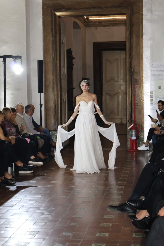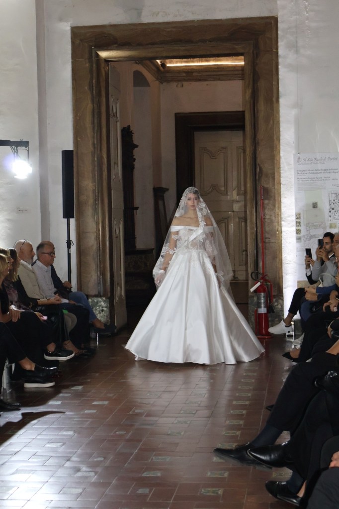 Lo stilista ha proposto le sue creazioni nella suggestiva cornice della Reggia di Portici. Abiti maestosi, barocchi, ma al contempo geometrici con giochi di trasparenze, ricchi di rouches, tagli, corsetti steccati con scolli omerali a barca che lasciano spazio alle scollature meno profonde.