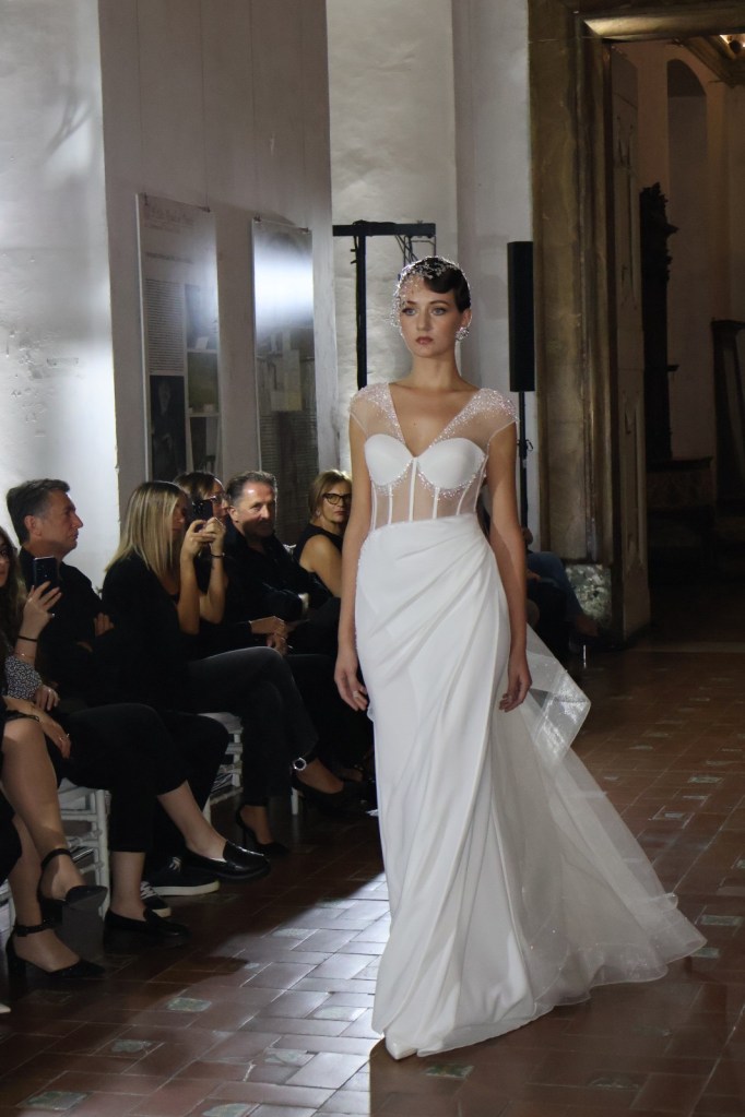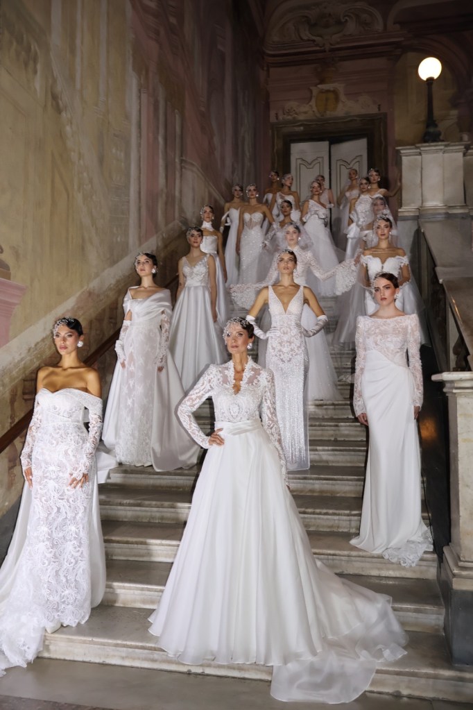 Le silhouette si sviluppano con abiti a sirena e romantici, fiori scultura, lavorazioni in 3D, come sempre in pedana molti abiti trasformabili lietmotiv di Molaro, creazioni che al momento del taglio della torta o durante il party si trasformano nei volumi e nelle lunghezze e stupiscono gli ospiti.