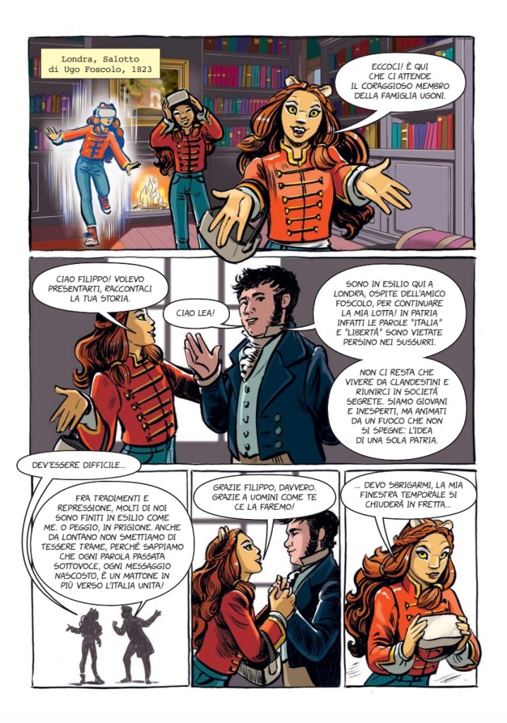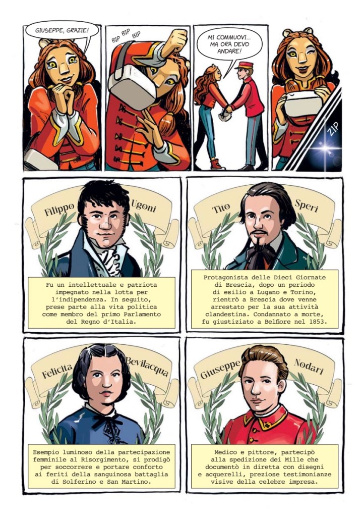 A completamento del progetto è stato realizzato anche un breve fumetto inedito, disegnato ad hoc dall’illustratrice Silvia Bigolin e curato da Fondazione Brescia Musei nella stesura dei contenuti, che verrà distribuito agli insegnanti e messo a disposizione del pubblico come strumento divulgativo e di approfondimento. Il fumetto riprende il linguaggio visivo e narrativo del progetto digitale, approfondendo con tono coinvolgente le vicende dei quattro protagonisti delle esperienze VR. Il linguaggio del fumetto, immediato e universale, è stato scelto per offrire una prospettiva coordinata alla realizzazione dei character e dei personaggi virtuali, favorendo una lettura trasversale tra linguaggi e pubblici diversi.