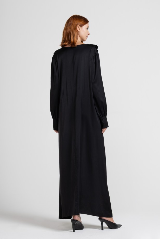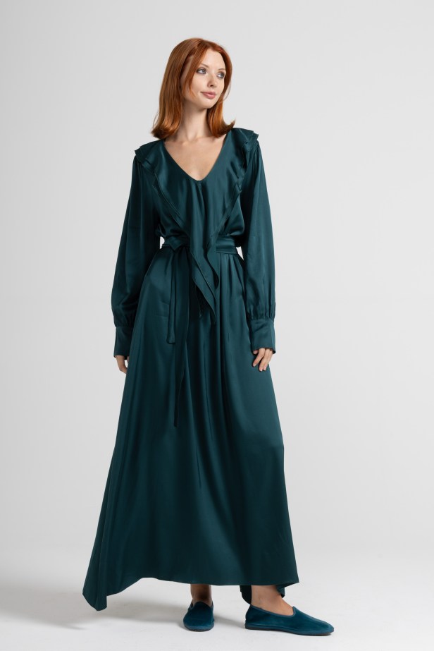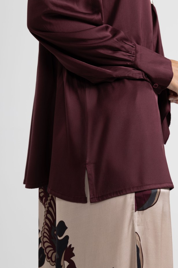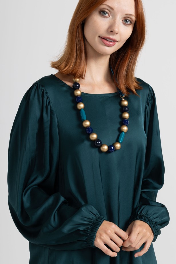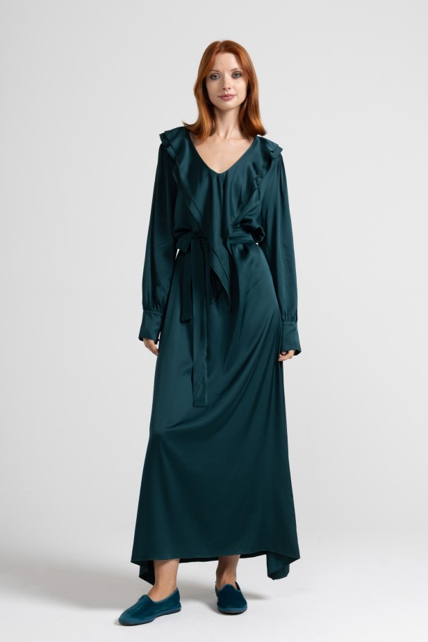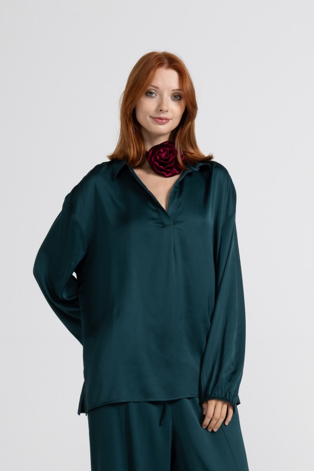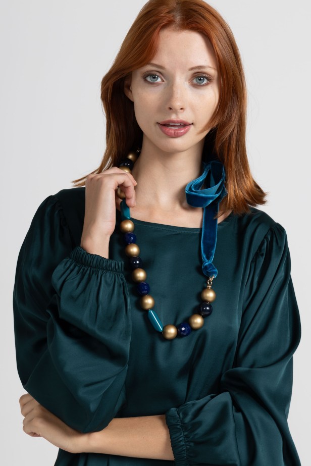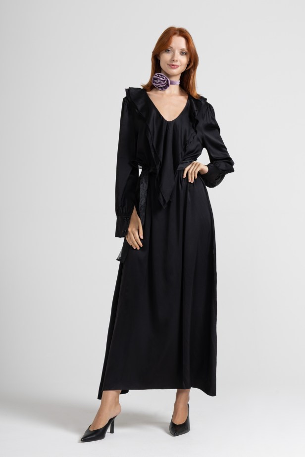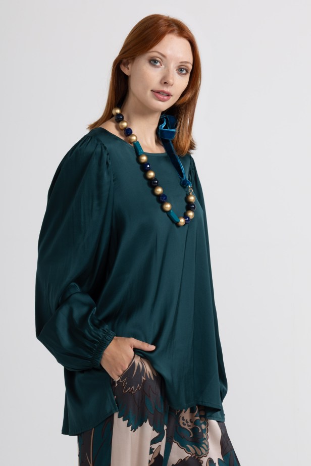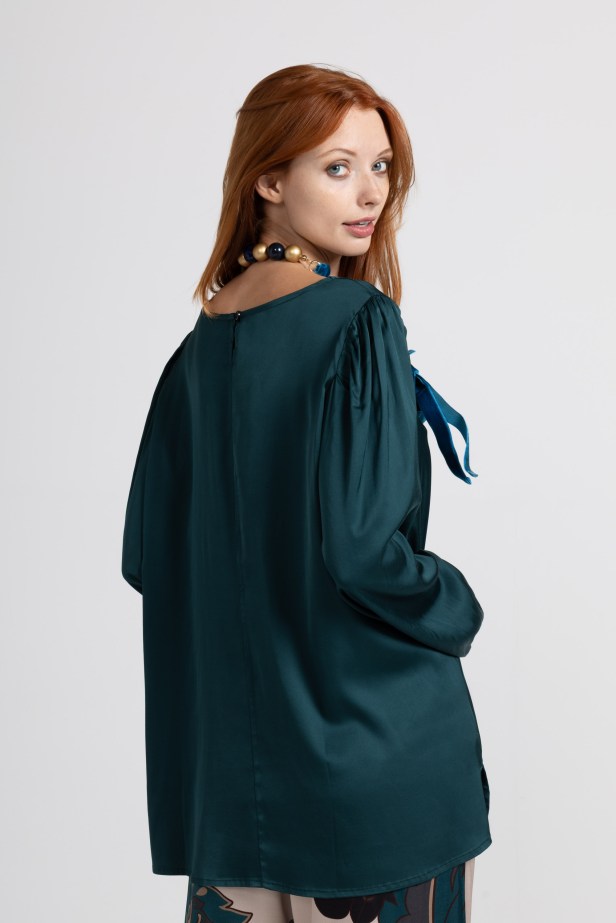 La proposta stilistica si distingue per le sue silhouette morbide e femminili, pensate per valorizzare il movimento e garantire comfort senza rinunciare all’eleganza: linee fluide e tagli curati caratterizzano bluse, pantaloni palazzo e abiti lunghi, con la linea a trapezio che ricorre come filo conduttore, donando armonia e leggerezza.