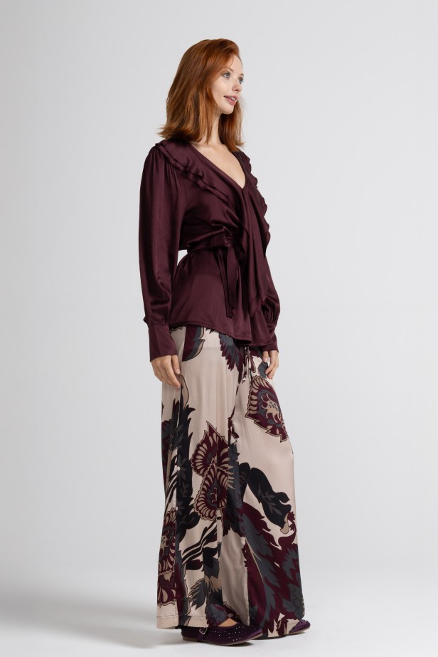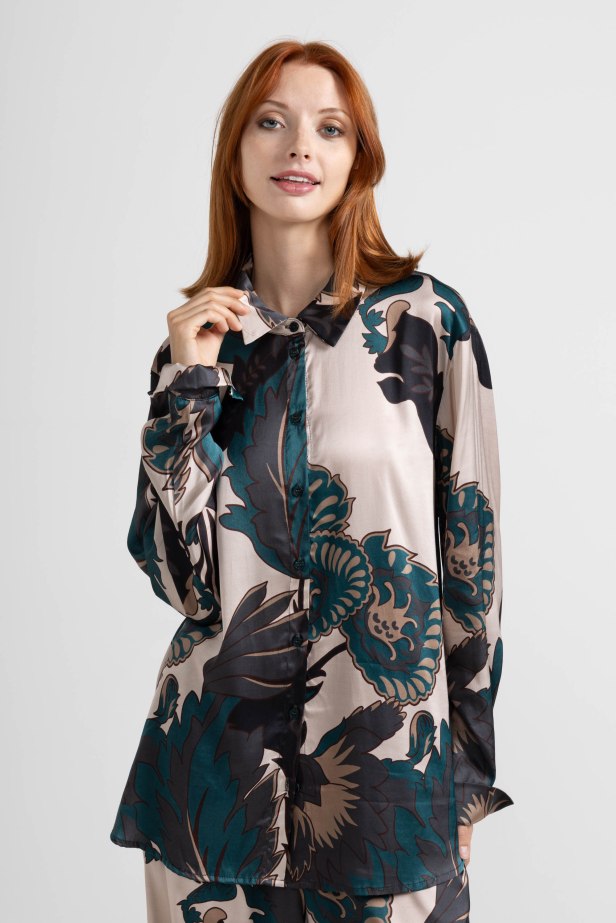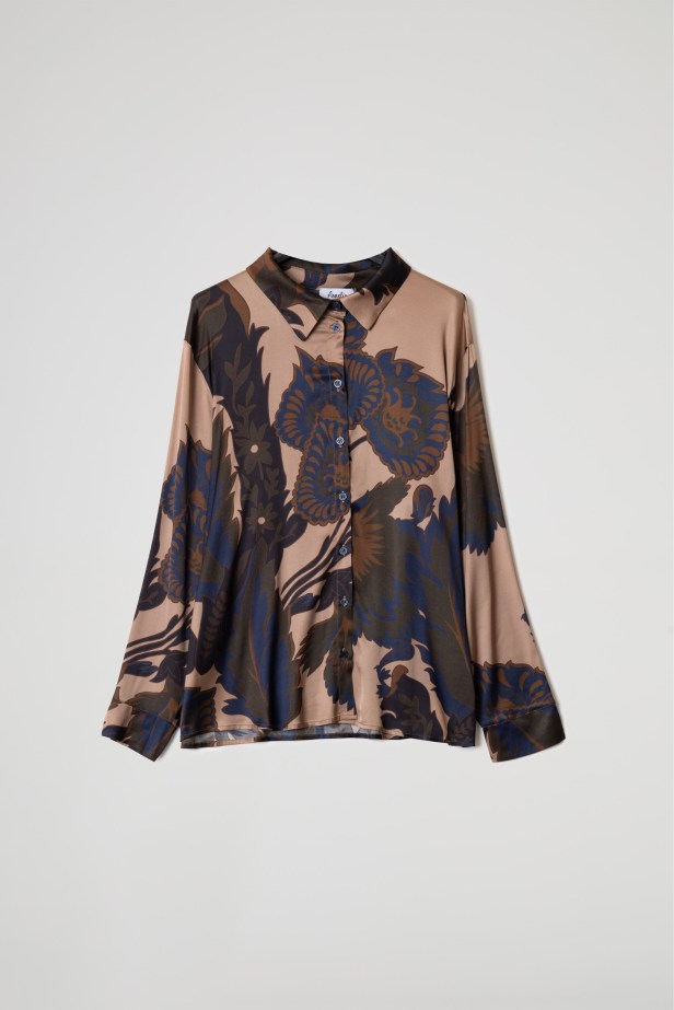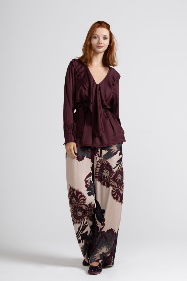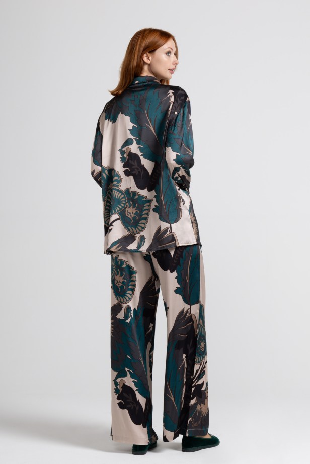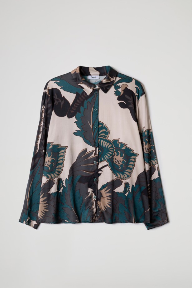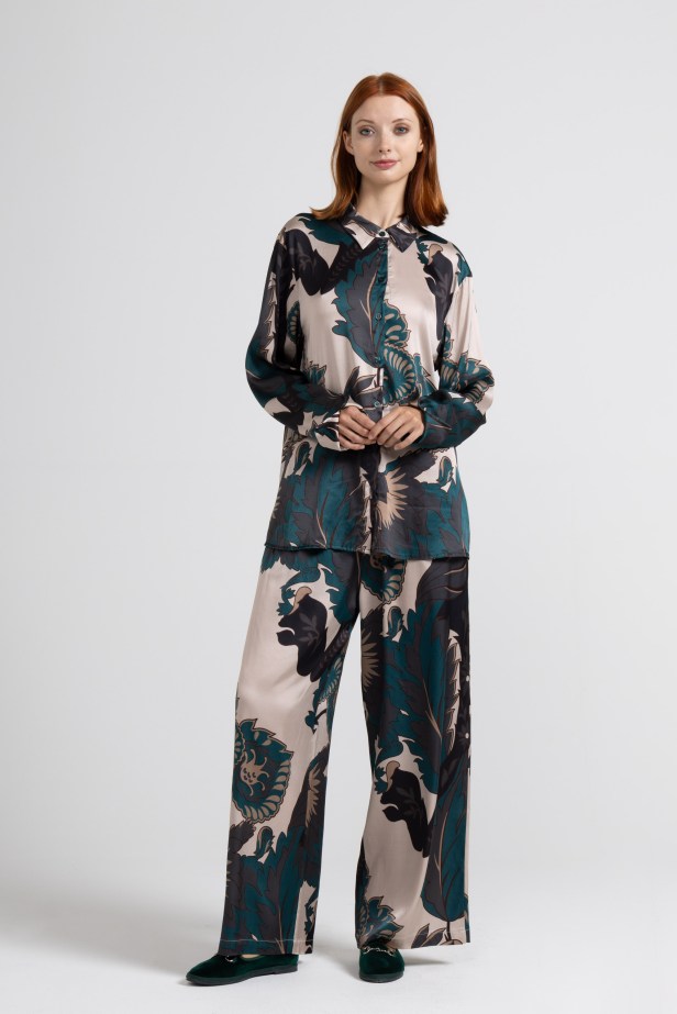 Nel dettaglio, la capsule include pantaloni palazzo con stampa French Garden ed elastico in vita, pantaloni palazzo in raso di viscosa stretch tinta unita con cuciture frontali che richiamano il tailoring, bluse con scollature polo o rotonde arricchite da ruches e spacchetti laterali, camicie con stampa delicata e bottoncini tono su tono, abiti lunghi in raso elasticizzato con cinture abbinate e t-shirt boxy in raso stampato.