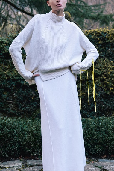 Le frange Gensami, elemento distintivo della collezione, vengono applicate con maestria su morbidi maglioni in cashmere e sensuali abiti in maglia, aggiungendo un tocco di leggerezza e sofisticata vivacità.