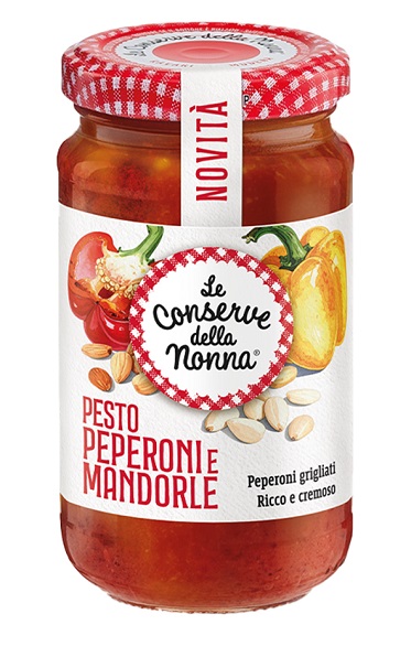 Pesto Peperoni e Mandorle –Con oltre il 40% di peperoni, un condimento vivace e colorato che sposa dolcezza e croccantezza, ideale per pasta, bruschette o piatti vegetariani gourmet.