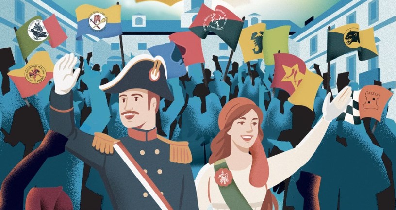 Questa è l’immagine ufficiale dell’edizione 2026 dello Storico Carnevale di Ivrea che celebra l’incontro tra le due anime della festa: il Corteo Storico, con i suoi due personaggi simbolo e gli aranceri con le loro bandiere, nella serata che precede la Battaglia. Sempre più, questo istante diventa simbolo pubblico e internazionale, capace di catturare l’attenzione dei media con la sua potenza visiva e sonora e di raccontare al mondo la forza della festa.