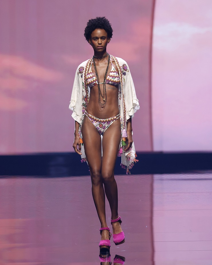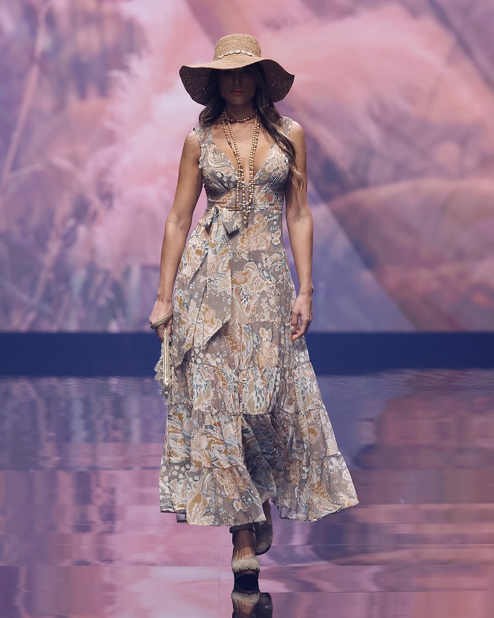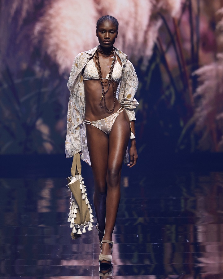 Ogni dettaglio contribuisce a costruire un’estetica sofisticata e consapevole, dove la bellezza si fa linguaggio e la libertà stile di vita. Abiti impalpabili si alternano a costumi ricchi di dettagli preziosi in un sogno che rievoca la Saint-Tropez degli anni Settanta; colori chiari e stampe luminose accendono la stagione, mentre le texture – Sangallo, georgette, paillettes, motivi folk e foliage esotici – raccontano un lusso autentico e sensoriale. Crochet, macramé e dettagli gioiello esprimono l’heritage artigianale di una beach couture versatile e sartoriale pensata per valorizzare ogni fisicità.