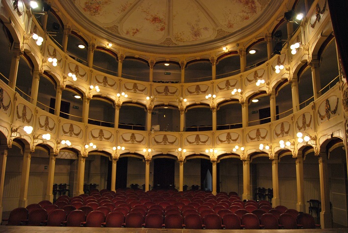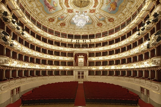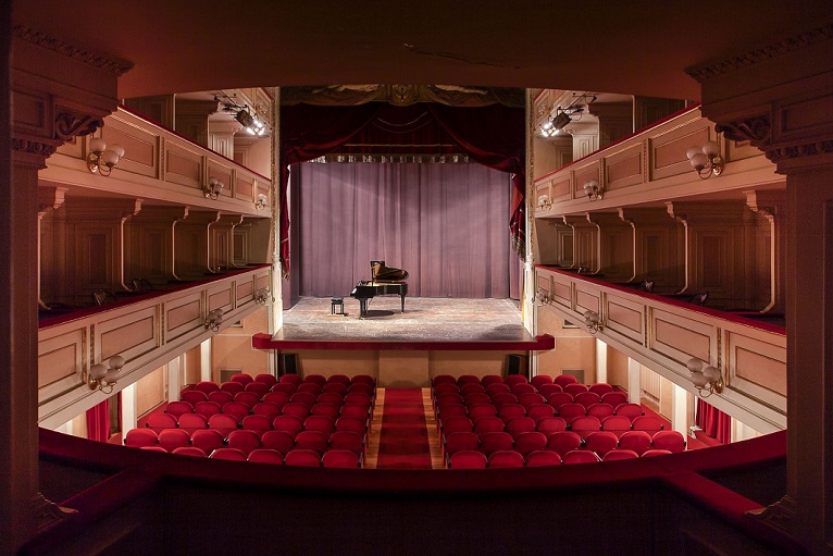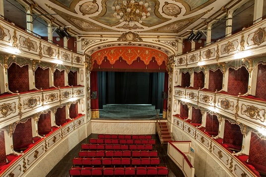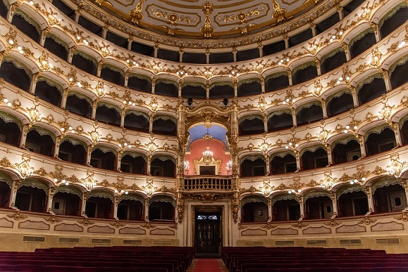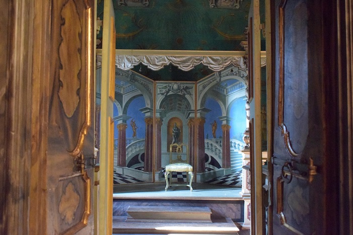 Il piccolo teatrino settecentesco è una bomboniera sospesa nel tempo, dove anche il silenzio sembra recitare.